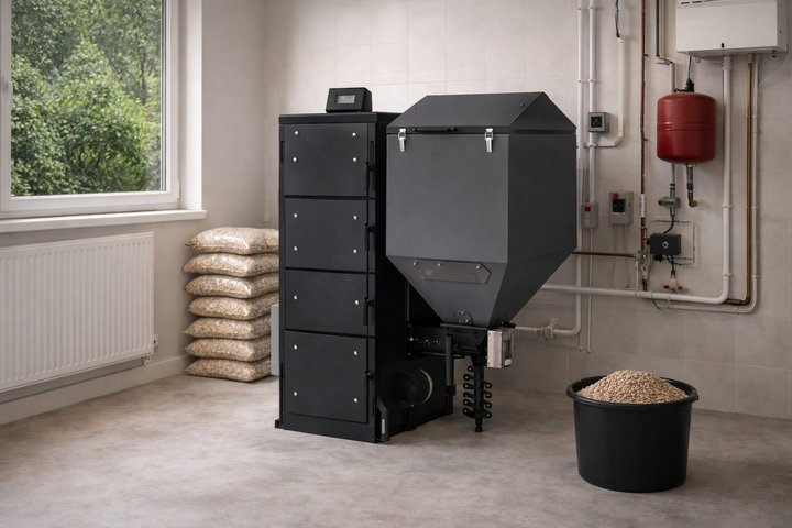 Пеллеты — это спрессованные опилки в виде маленьких цилиндриков. Котёл сам засыпает их из бункера шнеком, как кофемашина зерно. Забил бункер раз в неделю — и забыл. Управление через приложение, КПД под 95%, а в доме чисто: никакой золы на полу.