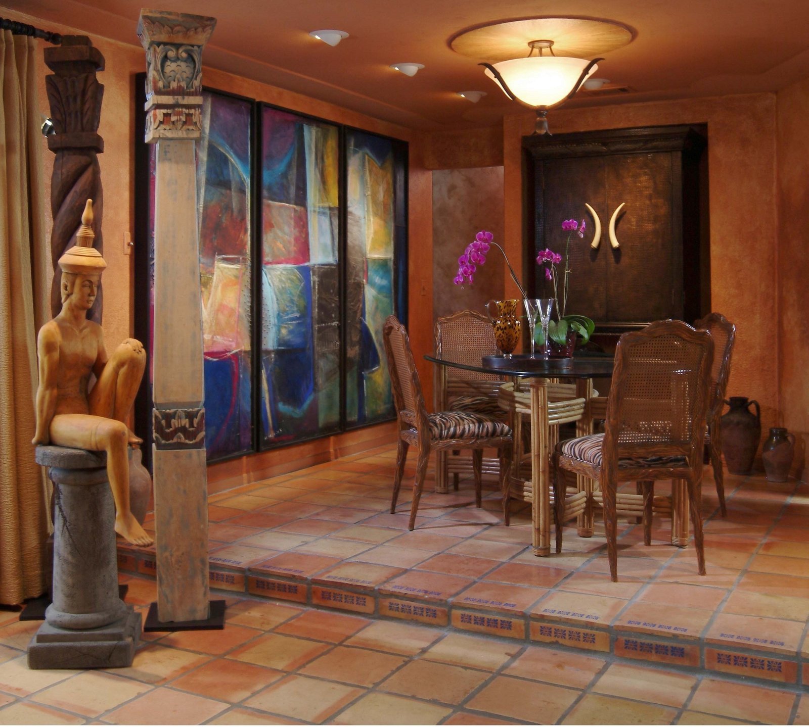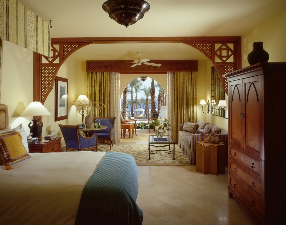 Арки своеобразной формы, украшенные резьбой или росписью, вместо дверных проемов или массивные кедровые двери с инкрустацией, резные карнизы, оконный текстиль с египетским орнаментом или иероглифами дополнят характерные приметы стиля.